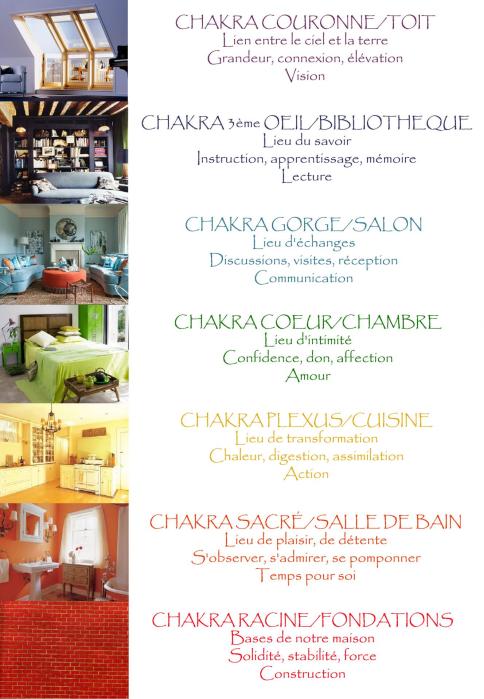 Ainsi, le chakra racine est devenu les fondations de la maison, la chakra sacré la salle de bain, la chakra plexus la cuisine, le chakra cœur la chambre, le chakra gorge le salon, le chakra 3ème œil la bibliothèque, et le chakra couronne le toit. Cette association permet de mieux comprendre le rôle que joue chaque chakra (voir le schéma ci dessous), tout devient clair et logique. Mais surtout, le but de cette comparaison est de voir nos chakras, et les soigner seul.