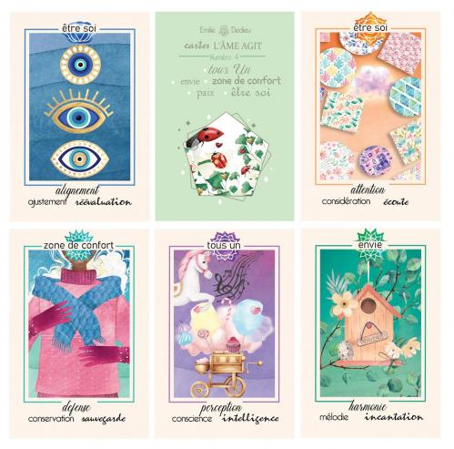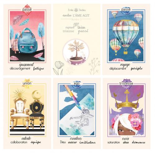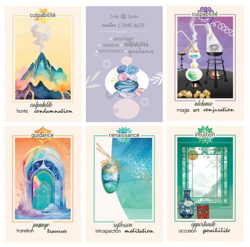 Chaque jeu "l'âme agit" de petit format mesurant 6cm sur 9cm, se compose de 35 cartes, auxquelles s'ajoutent 6 cartes de présentation. Chaque carte représente 1 famille énergétique, et est reliée à un chakra. Il est possible de mélanger les 3 jeux pour n'en faire qu'un. Au bas de chaque carte divers mots-clés apparaissent, cela permet d'utiliser le jeu sous forme d'oracle, afin de recevoir divers guidances et conseils de vie.