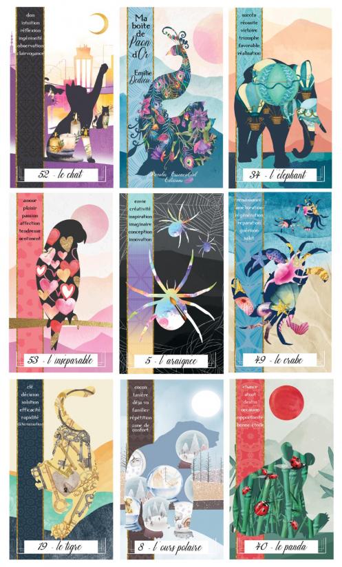 "Ma boîte de Paon d'Or" est un oracle de 65 cartes mesurant 7cm sut 12 cm. Il se compose de 58 lames créées par mes soins, accompagnées de 2 cartes d'introduction, de plusieurs exemples de tirages, mais aussi il contient 58 guidances instantanées.
