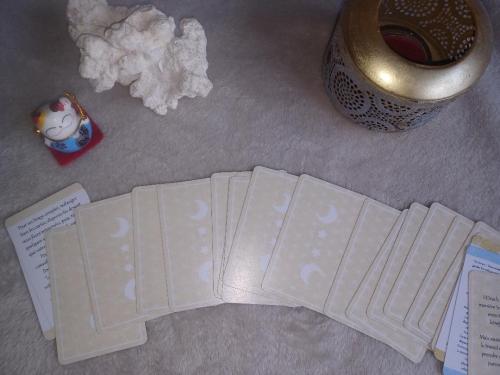 L'oracle des prières se compose de 21 cartes (16 lames dont 5 cartes explicatives) de très petit format 5,7 cm sur 8,9 cm, toutes recherchées et illustrées par mes soins. C'est un oracle assez petit qui se glissera dans toutes les poches.